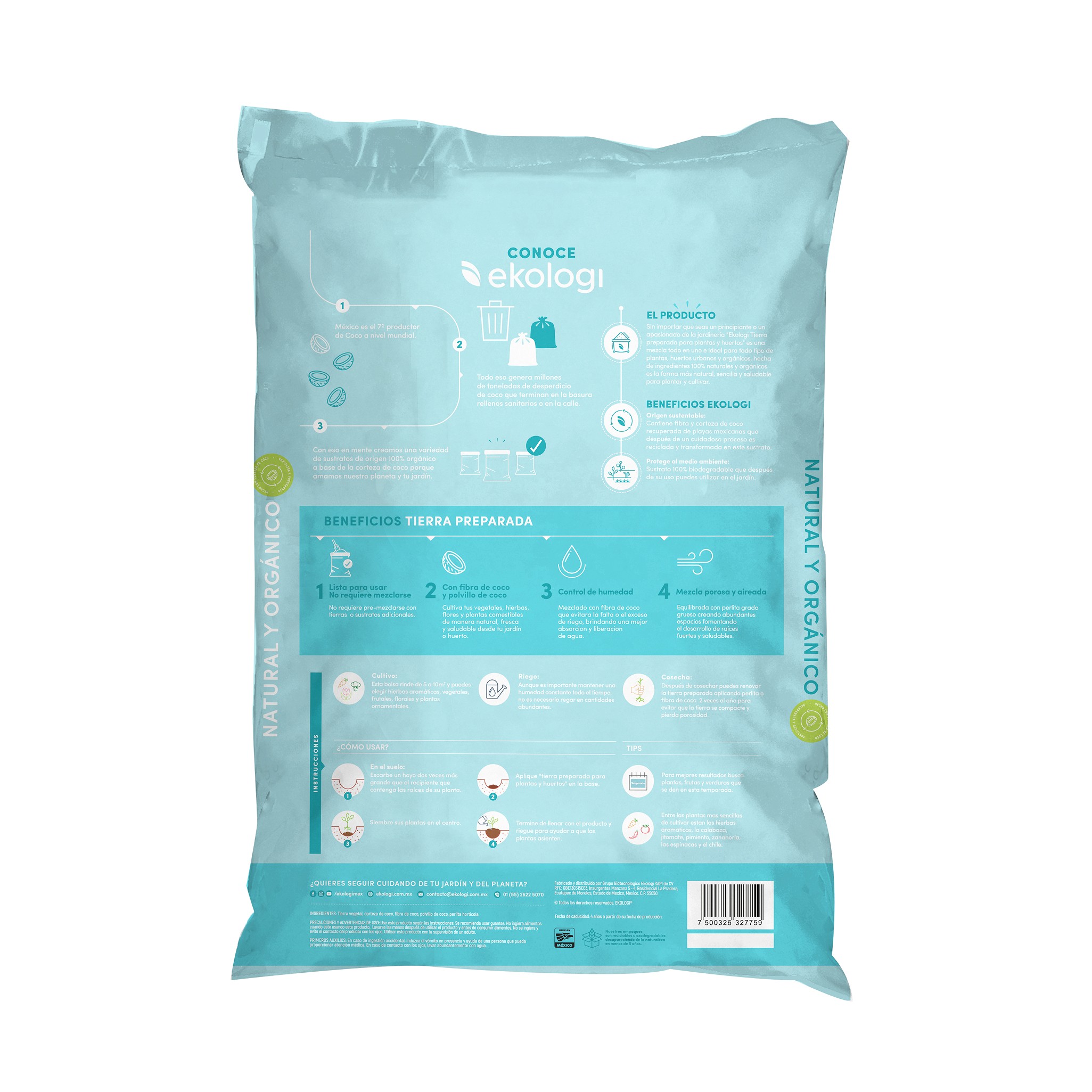 Sin importar que seas un principiante o un apasionado de la jardineria "EKOLOGI Tierra preparada para plantas y huertos" es una mezcla todo en uno e ideal para todo tipo de plantas, huertos urbanos y organicos, hecha de ingredientes 100% naturales y organicos es la forma mas natural, sencilla y saludable para plantar y cultivar.